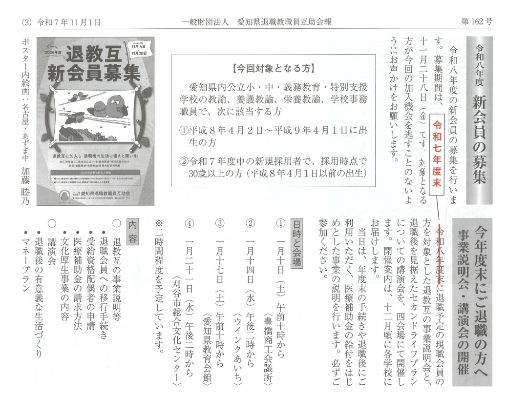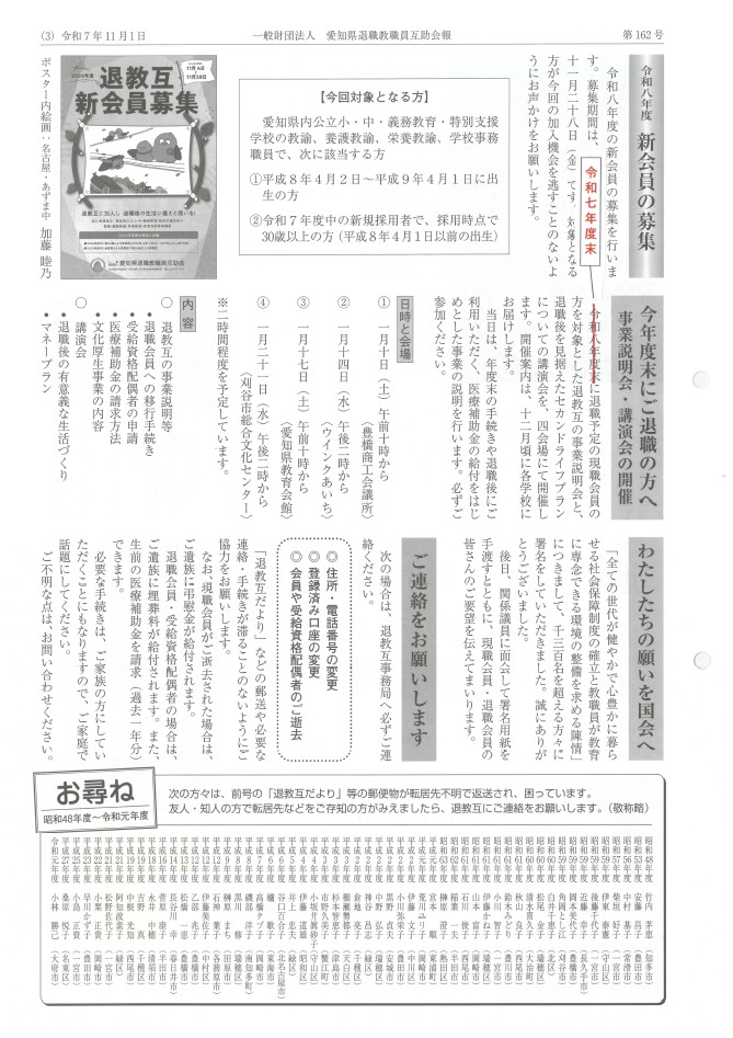 愛知県退職教職員互助会 HOMEへkeyboard_arrow_right 新着情報 あいち退教互だより162号の訂正について 2025年11月7日 金曜日 あいち退教互だより162号の訂正について あいち退教互だより(3)ページに以下の通りに、1か所訂正があります。